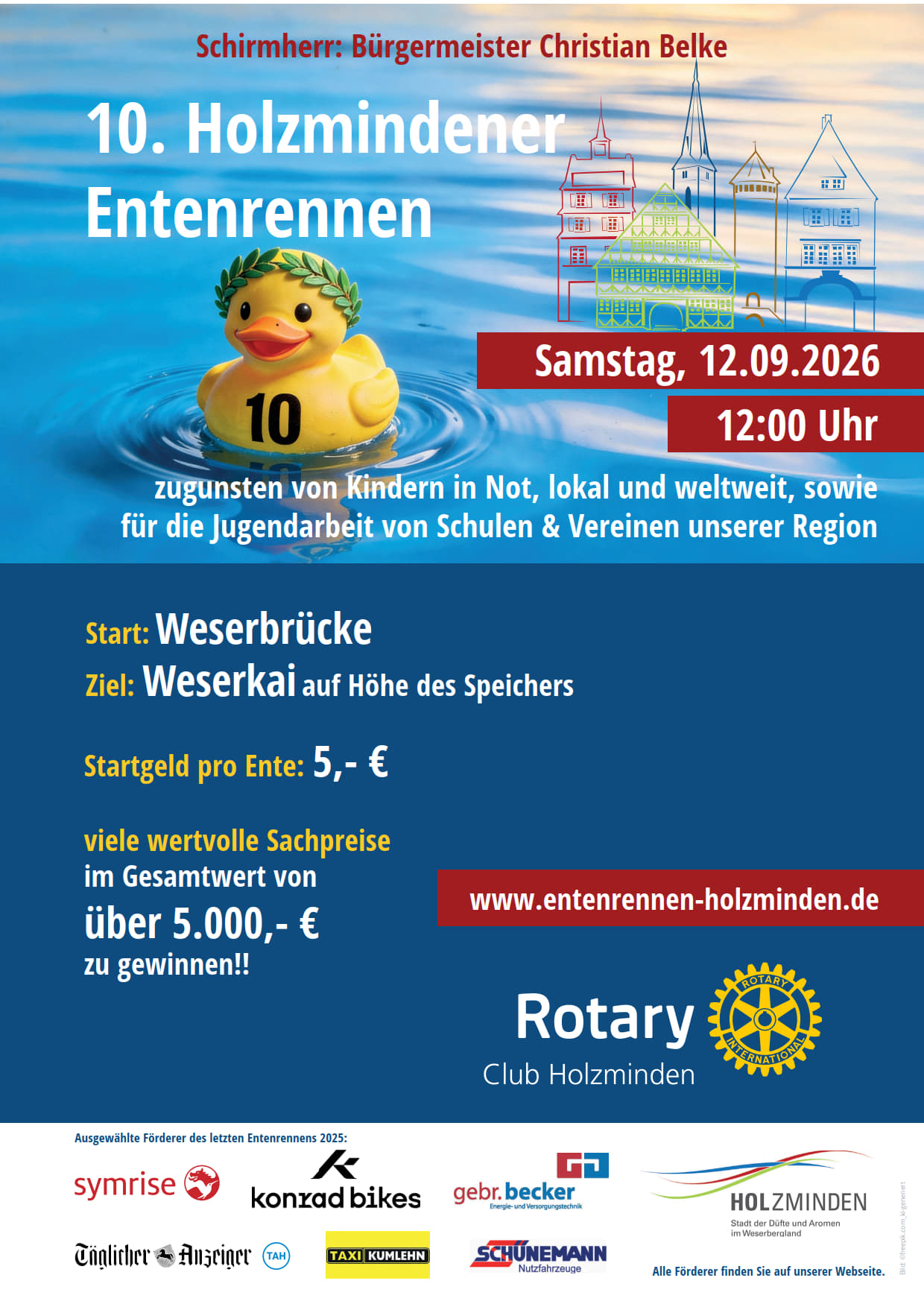 In diesem Jahr veranstaltet der Rotary-Club Holzminden das 10. Entenrennen! Das Jubiläumsrennen wird am 12. September 2026 von 12-14 Uhr wieder am Weserkai Holzminden stattfinden. Einige Tausend knallgelbe Gummienten werden dann zwischen Weserbrücke und Getreidespeicher um die besten Plätze schwimmen. Die ersten Plätze werden mit attraktiven Gewinnen von insgesamt über 5000 Euro belohnt.