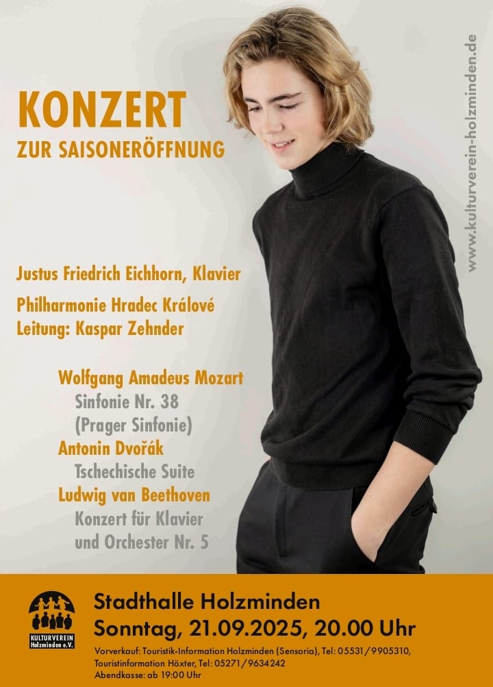 Das Programm des Eröffnungskonzertes am 21. September 2025 umfasst weltbekannte Werke von Wolfgang Amadeus Mozart(Sinfonie Nr. 38 = „Prager Sinfonie“), Antonin Dvórák ( „Tschechische Suite“) und Ludwig van Beethoven( Konzert für Klavier und Orchester Nr. 5). Die Solopartie am Klavier übernimmt der erst 15-Jährige Justus Friedrich Eichhorn. Er gilt als eines der herausragendsten Musiktalente seiner Generation. Seine ausdrucksstarke, freie und kreative Musikalität und seine brillante Technik fesseln das Publikum, wo immer er auftritt. Begleitet wird er von der Philharmonie Hradec Králové aus der Tschechischen Republik, welche in vielen bedeutenden Konzertsälen Europas aufgetreten ist. Die Leitung des Konzertabends obliegt Gastdirigent Kaspar Zehnder, seit 2012 Chefdirigent des Sinfonieorchesters Biel Solothurn. Seine umfangreichen Erfahrungen spiegeln sich schon allein in seiner vielfältigen Diskografie wieder.