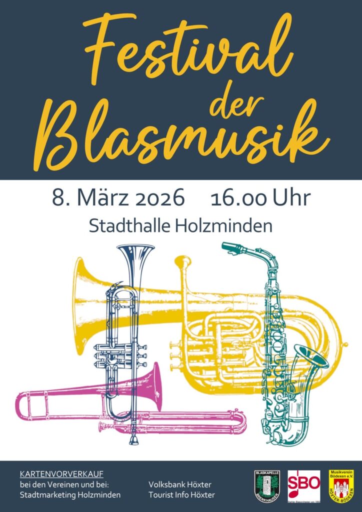 Am Sonntag, 8. März 2026, laden das Weserberglandorchester Bödexen, die Blaskapelle Brenkhausen und das Stahler Blasorchester gemeinsam zum Festival der Blasmusik in die Stadthalle Holzminden ein. Das Gemeinschaftskonzert hat sich in den vergangenen Jahren zu einem festen Bestandteil des kulturellen Lebens in der Region entwickelt und zieht regelmäßig zahlreiche Musikbegeisterte an. Die Besucherinnen und Besucher dürfen sich am 08. März 2026 auf ein abwechslungsreiches und anspruchsvolles Konzertprogramm freuen.