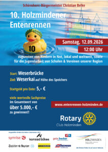 In diesem Jahr veranstaltet der Rotary-Club Holzminden das 10. Entenrennen! Das Jubiläumsrennen wird am 12. September 2026 von 12-14 Uhr wieder am Weserkai Holzminden